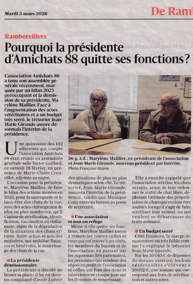 Cette section du site contient une selection d'articles de journaux, relatant les actions de l'association Ami CHATS 88 dans la durée, découpés dans les différents journaux de la presse locale :